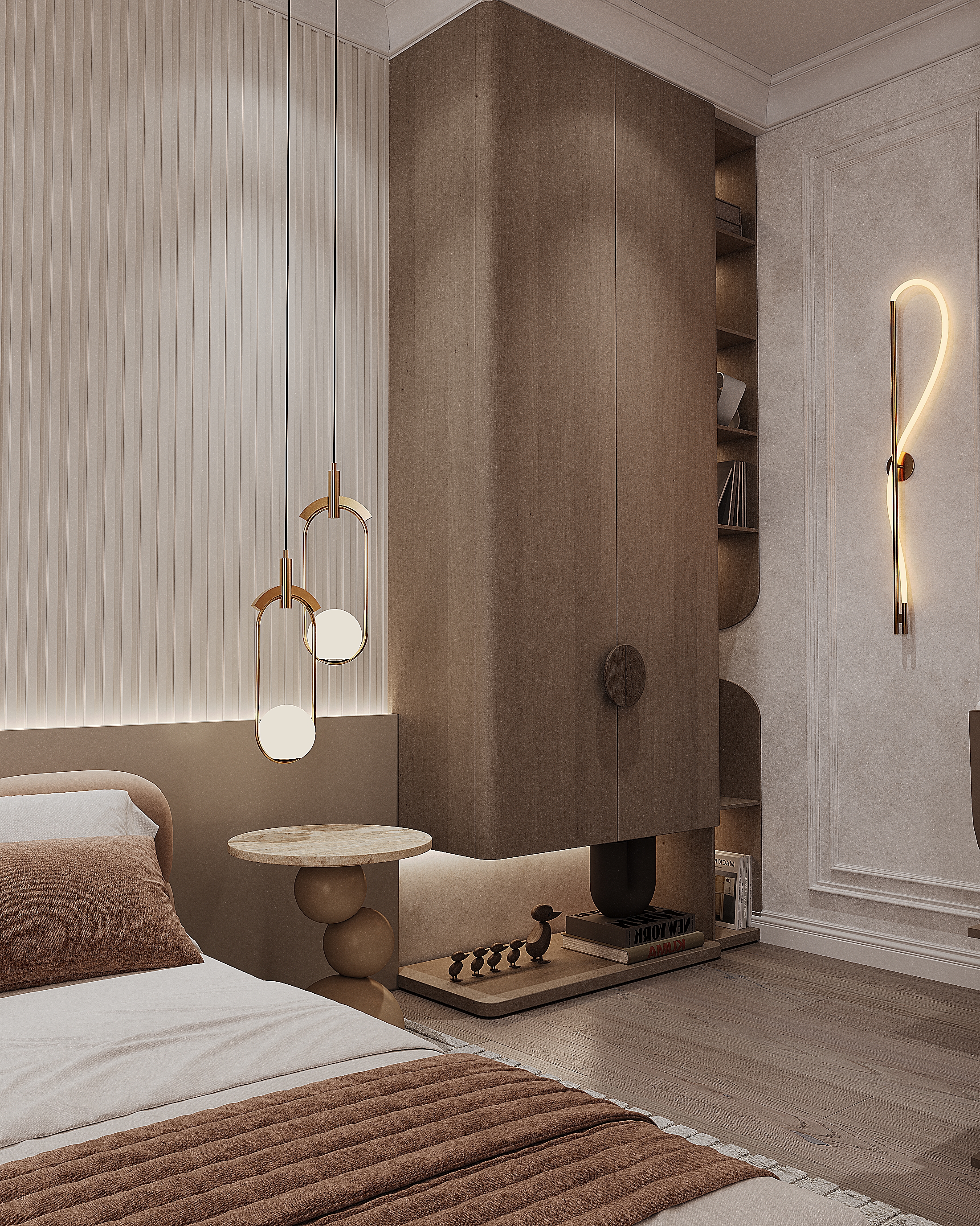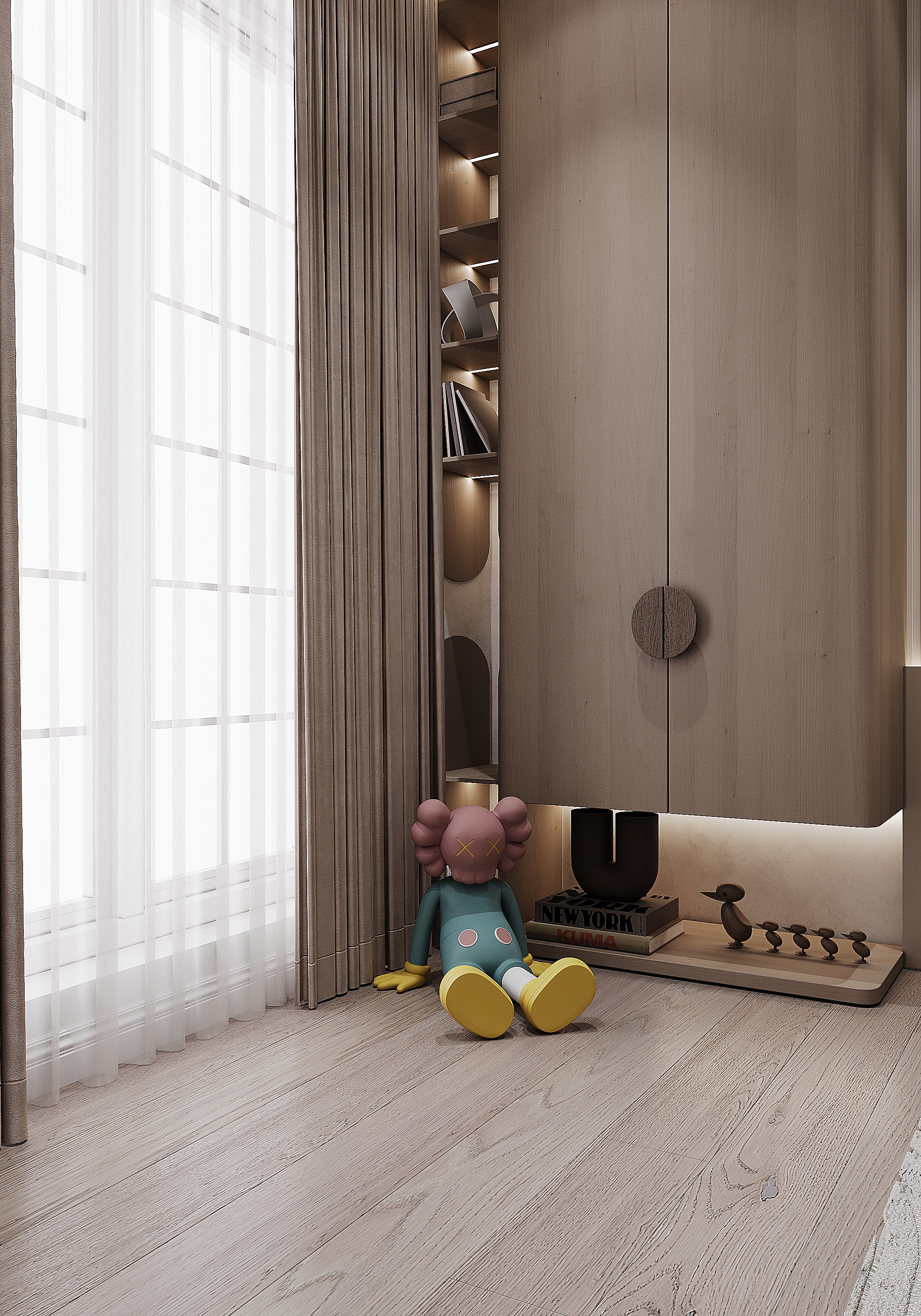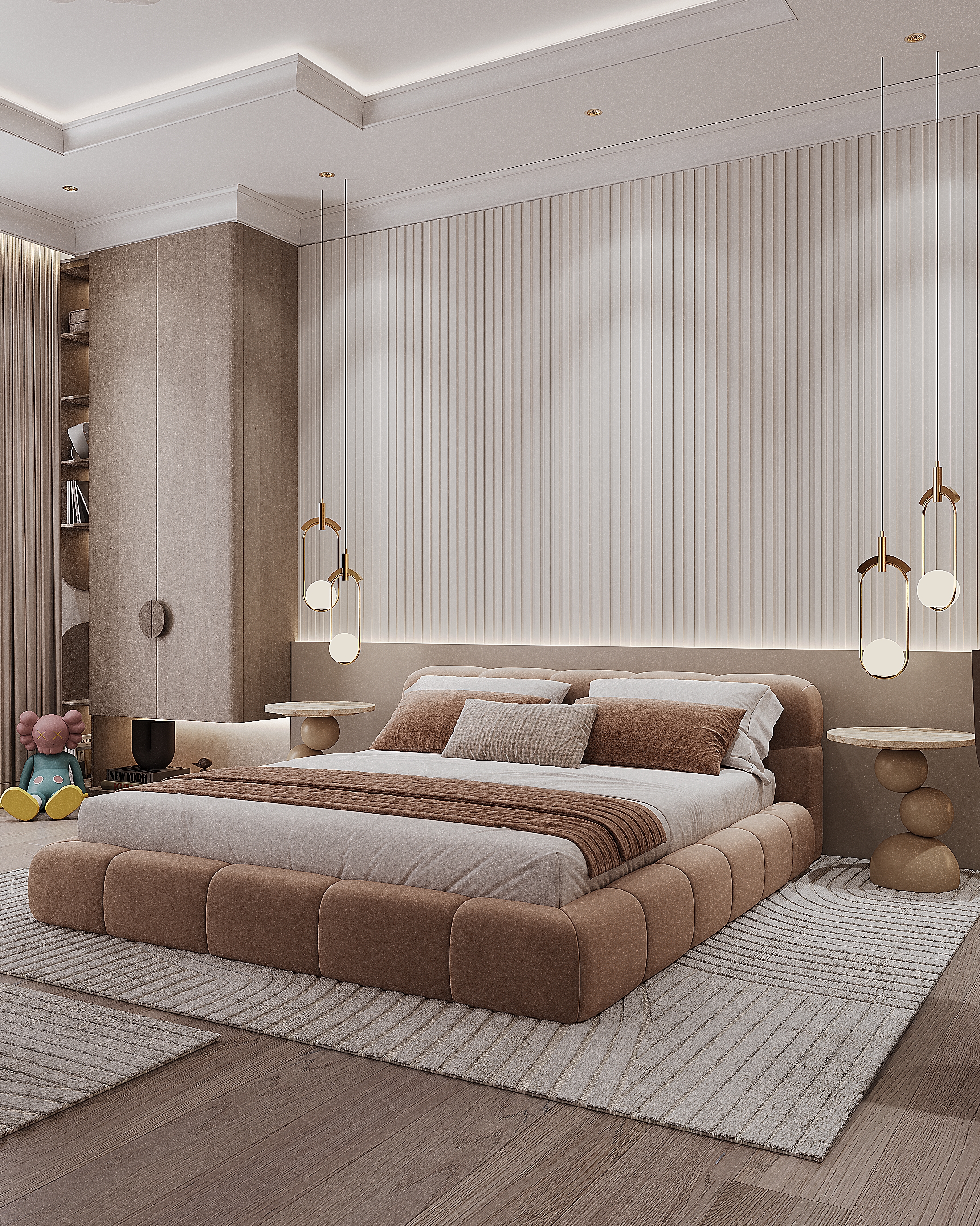 Функциональное зонирование: Квартира разделена на удобные и гармоничные зоны: гостиная, кухня, спальня и рабочее пространство. Важным моментом является открытая планировка кухни и гостиной, что способствует пространственному восприятию и лучшему использованию пространства. Современный стиль: Интерьер выполнен в стиле минимализма с элементами скандинавского дизайна. Простота форм, чистота линий и гармоничные цветовые решения создают спокойную атмосферу, подходящую для отдыха и работы.