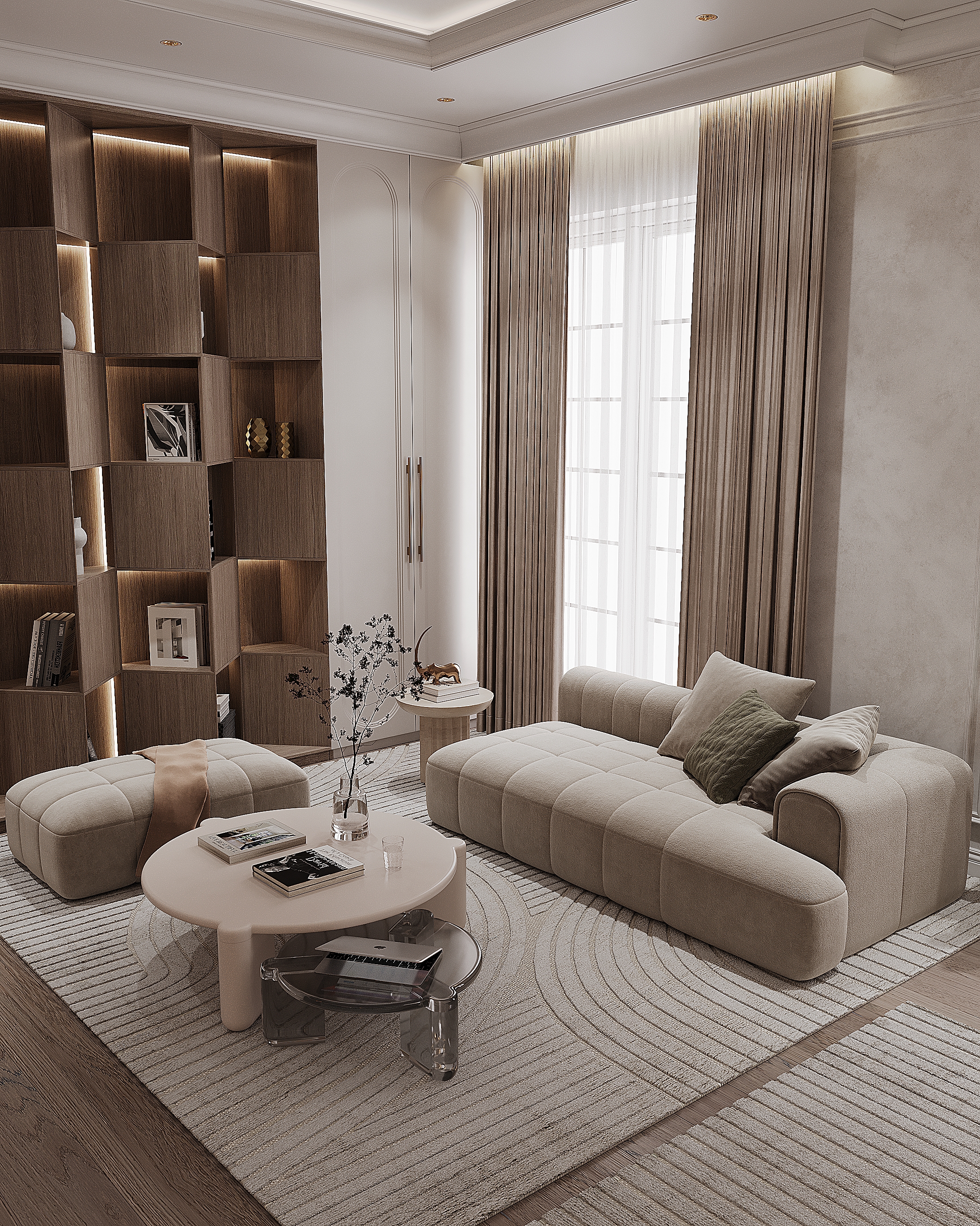 Многофункциональность: Мебель и техника интегрированы таким образом, чтобы сохранять максимальное пространство. Встроенные системы хранения и многофункциональные решения позволяют минимизировать лишние элементы и освободить пространство. Экологичность материалов: Использование натуральных материалов, таких как дерево, камень, стекло и текстиль, в сочетании с современными технологиями для создания стильного и экологичного интерьера.