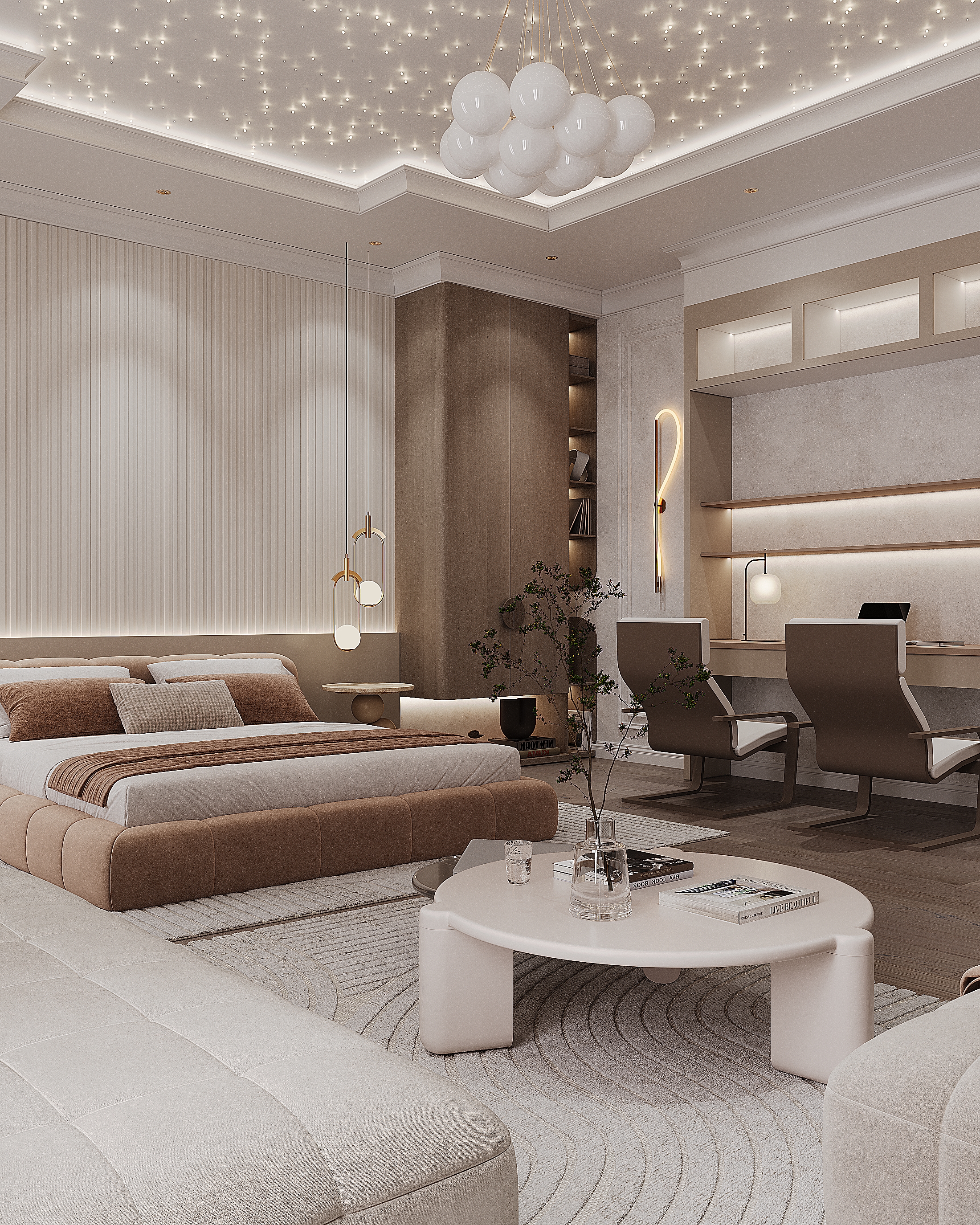 Планировка: Квартира разделена на функциональные зоны: просторная гостиная, отдельная кухня с обеденной зоной, уютная спальня, ванная комната с современными сантехническими решениями, рабочий уголок для удалённой работы. Открытое пространство между кухней и гостиной создаёт ощущение простора. Стиль: Выбран современный стиль с элементами минимализма и скандинавского дизайна. Простота и функциональность во всем: аккуратные линии, отсутствие лишних деталей, но с акцентом на удобство и эстетику.